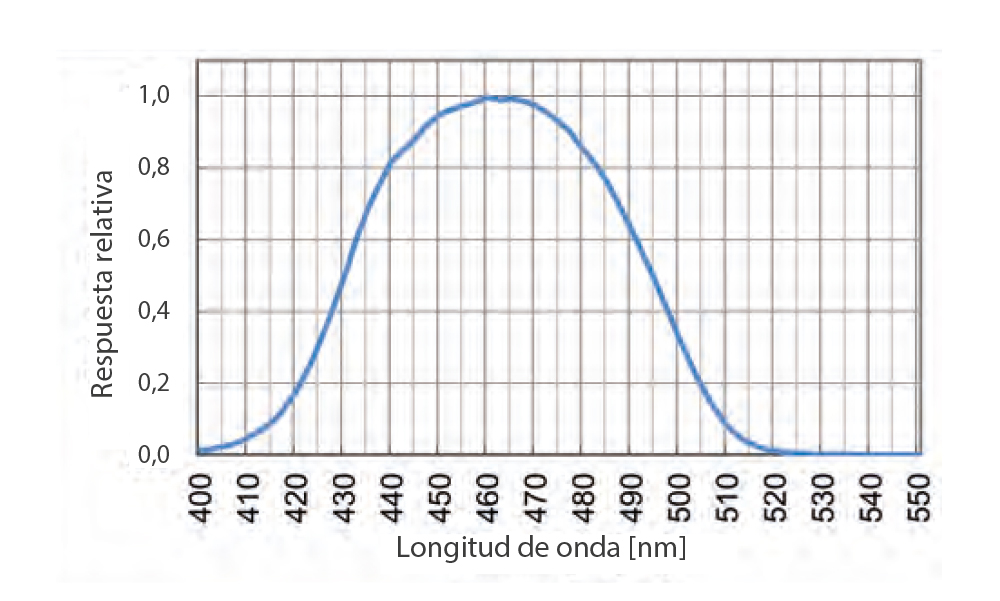 El sistema óptico de precisión ofrece mediciones fiables y reproducibles, mostrando la unidad de medición estándar: microvatios por centímetro cuadrado por nanómetro (µW/cm²/nm).